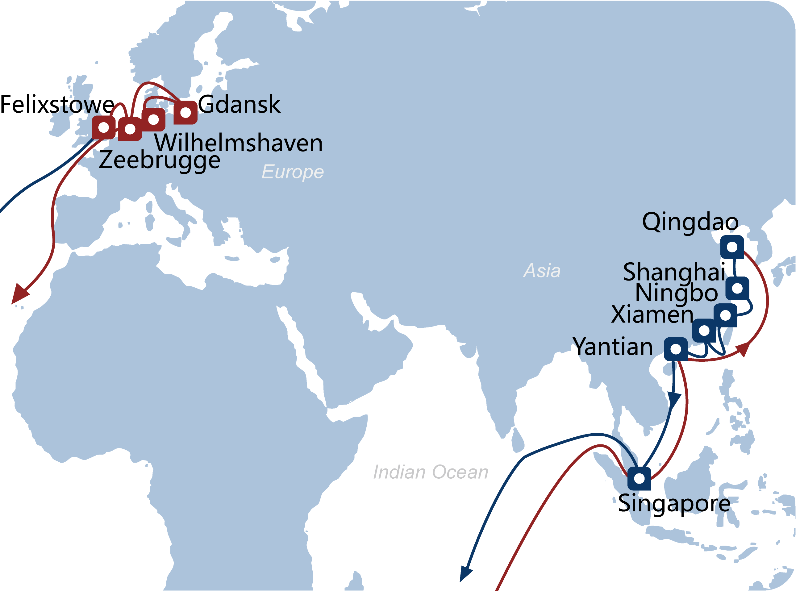 Asia-North Europe 1 Asia-North Europe 2 Asia-North Europe 3 Asia-North Europe 4 Asia-North Europe 5 Asia-North Europe 6 Asia-North Europe 7 North Europe North Africa Mediterranean Service North Europe North Africa Mediterranean Service India/Middle East-North Europe Europe Pakistan India Consortium 1 Europe Pakistan India Consortium 2 Europe Pakistan India Consortium 3 Atlantic North East Coast Service Atlantic South East Coast Service Atlantic Mexico/Gulf Coast Service Atlantic West Coast Service(Non-OA) Gateway Express 1 Gateway Express 2 Latin America/Africa-ESE2 Latin America/Africa-EWX