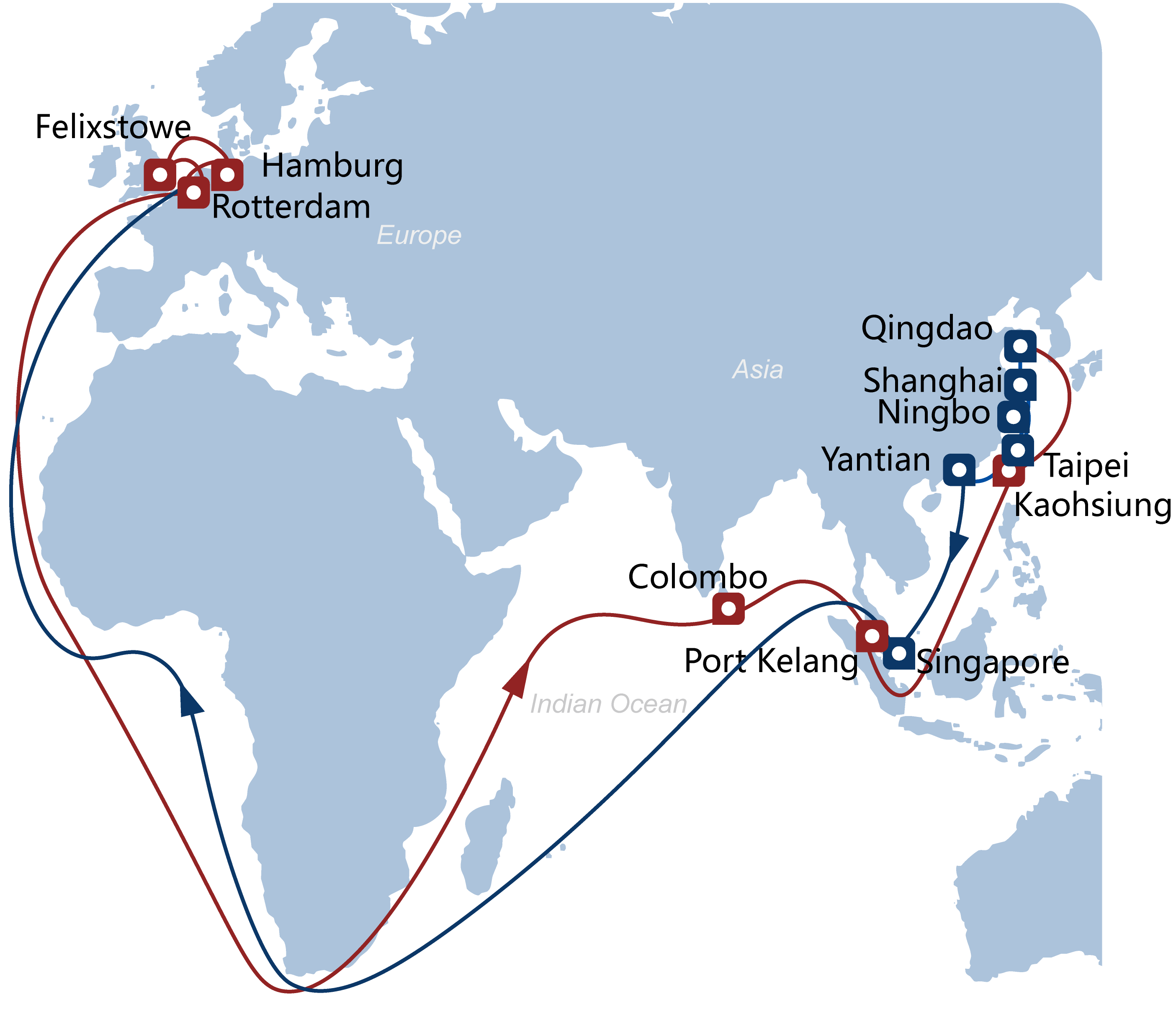Asia-North Europe 1 Asia-North Europe 2 Asia-North Europe 3 Asia-North Europe 4 Asia-North Europe 5 Asia-North Europe 6 Asia-North Europe 7 North Europe North Africa Mediterranean Service North Europe North Africa Mediterranean Service India/Middle East-North Europe Europe Pakistan India Consortium 1 Europe Pakistan India Consortium 2 Europe Pakistan India Consortium 3 Atlantic North East Coast Service Atlantic South East Coast Service Atlantic Mexico/Gulf Coast Service Atlantic West Coast Service(Non-OA) Gateway Express 1 Gateway Express 2 Latin America/Africa-ESE2 Latin America/Africa-EWX