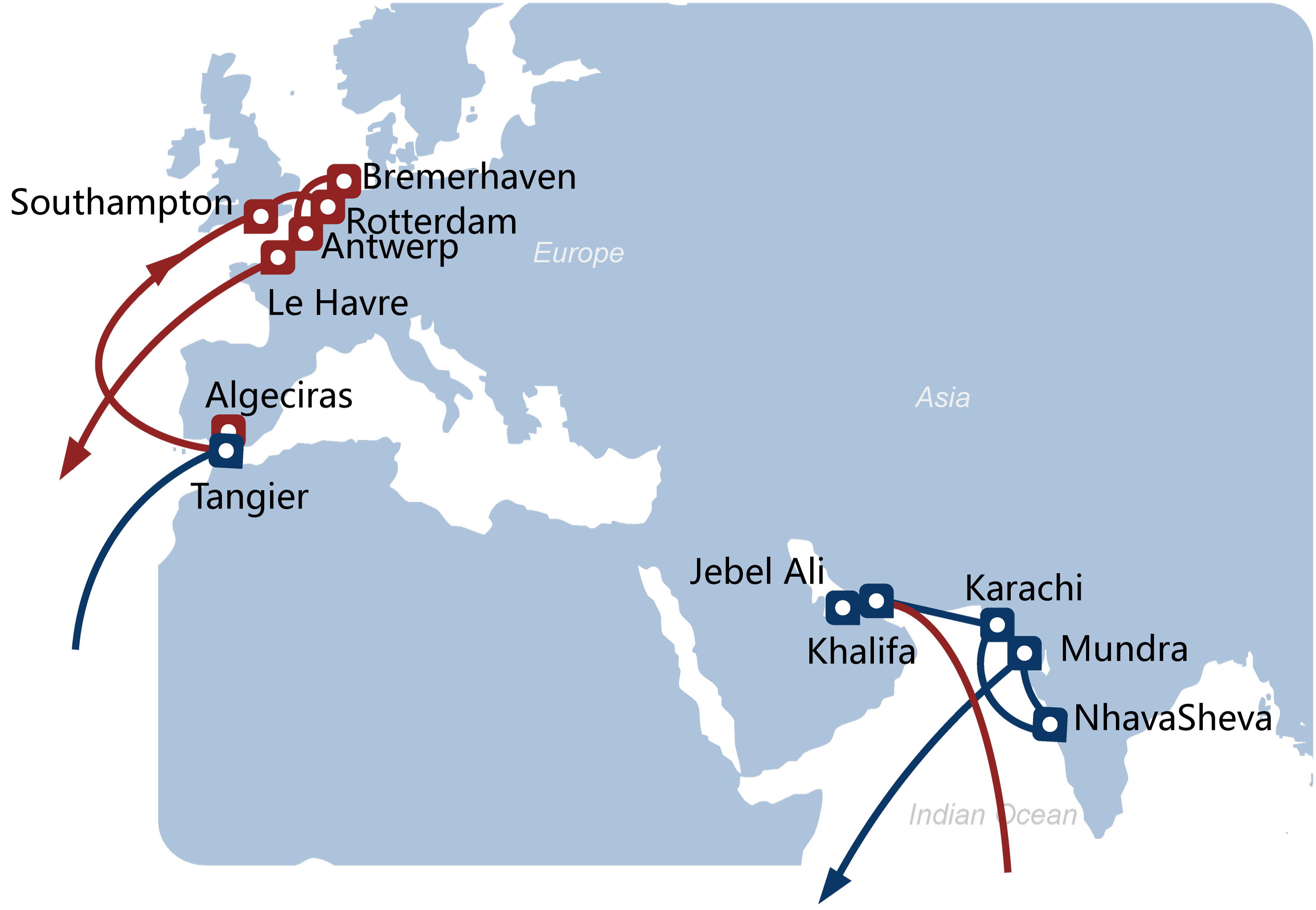 Asia-North Europe 1 Asia-North Europe 2 Asia-North Europe 3 Asia-North Europe 4 Asia-North Europe 5 Asia-North Europe 6 Asia-North Europe 7 North Europe North Africa Mediterranean Service North Europe North Africa Mediterranean Service India/Middle East-North Europe Europe Pakistan India Consortium 1 Europe Pakistan India Consortium 2 Europe Pakistan India Consortium 3 Atlantic North East Coast Service Atlantic South East Coast Service Atlantic Mexico/Gulf Coast Service Atlantic West Coast Service(Non-OA) Gateway Express 1 Gateway Express 2 Latin America/Africa-ESE2 Latin America/Africa-EWX